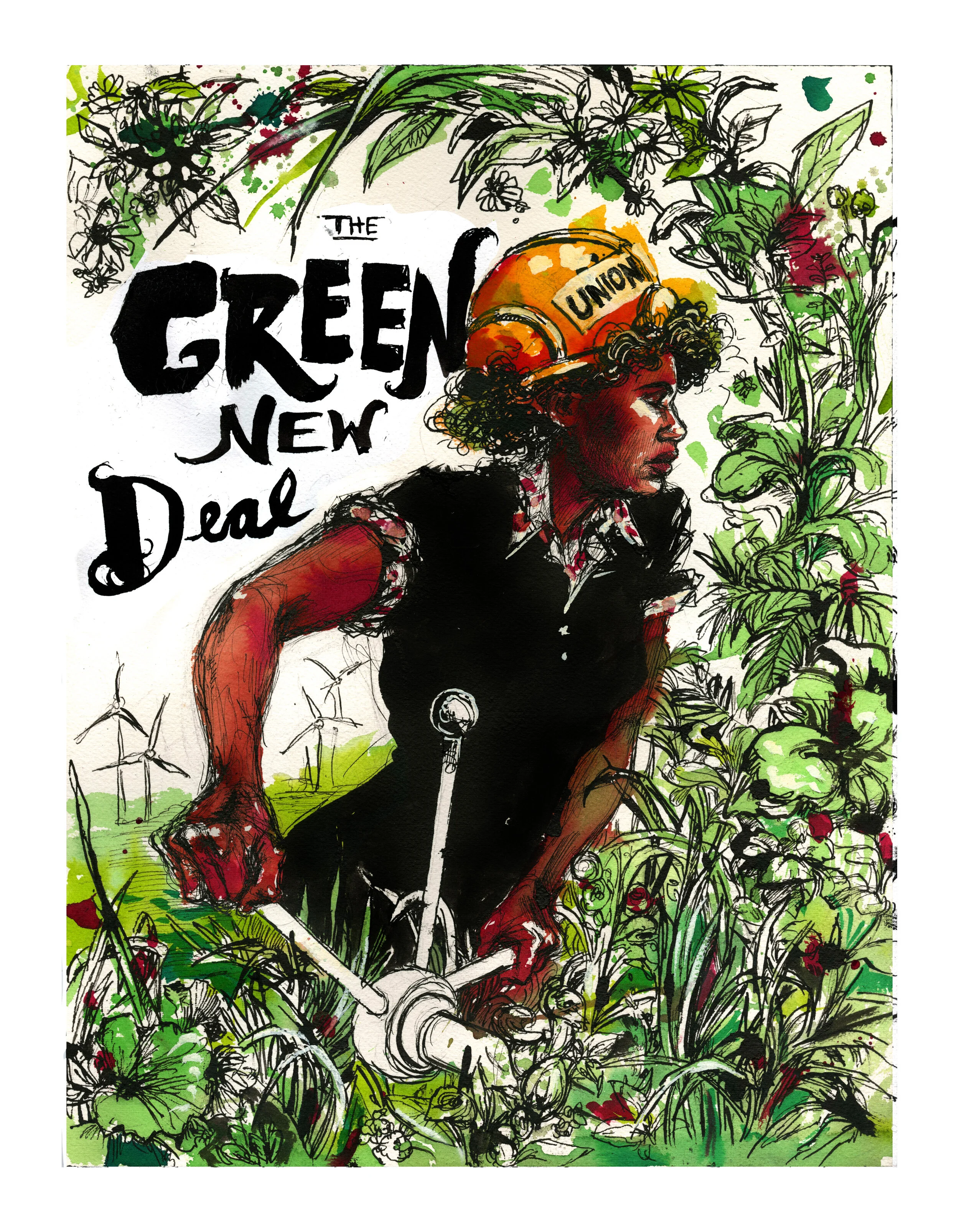 Green New Deal art by Molly Crabapple. You can find art like Molly’s to use for activism at Art.350.org.